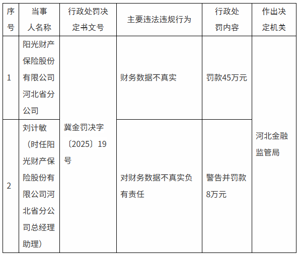 阳光财产保险股份有限公司河北省分公司因“财务数据不真实”,被处罚款45万元;