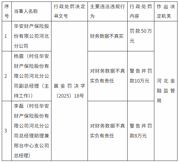 华安财产保险股份有限公司河北分公司因“财务数据不真实”,被处罚款50万元;