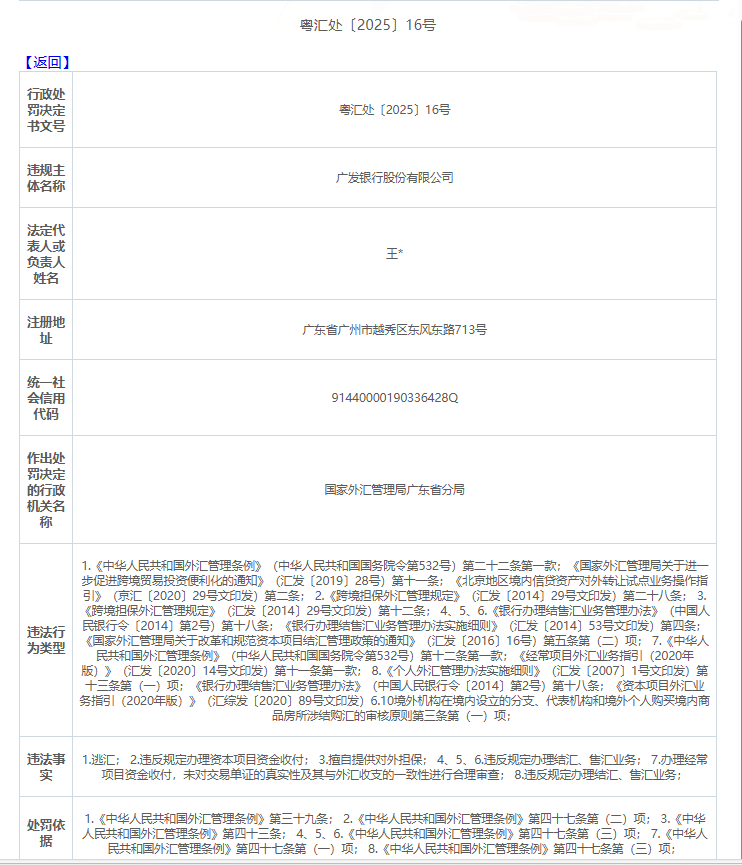 因上述违法事实,国家外汇管理局广东省分局依据《中华人民共和国外汇管理条例》,对广发银行予以警告,并处以罚款、没收违法所得总金额为1537.83万元。