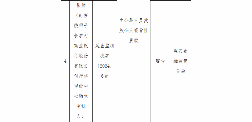 陕西子长农村商业银行股份有限公司因“向公职人员发放个人经营性贷款”被罚35万元,时任该公司授信审批中心独立审批人张帅被警告;