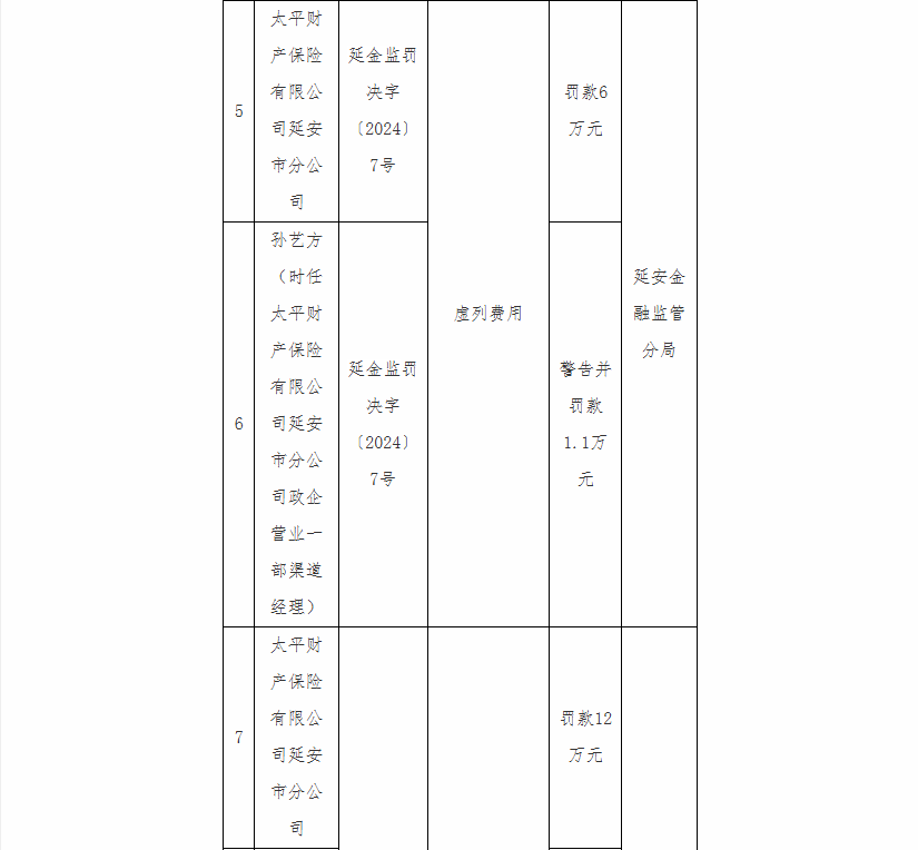 太平财产保险有限公司延安市分公司因“虚列费用”被罚6万元,因“虚挂个人代理中介业务套取手续费”被罚12万元,合计罚款18万元,时任该公司政企营业一部渠道经理孙艺方被警告并罚款1.1万元,时任该公司志丹支公司经理赵丹被警告并罚款1.1万元;