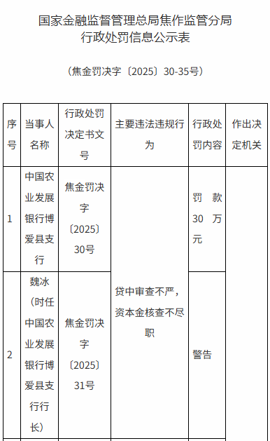 中国农业发展银行博爱县支行因“贷中审查不严,资本金核查不尽职”被罚款30万元,时任该行行长魏冰被警告;