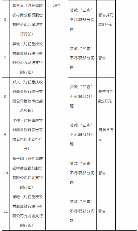 张崇义,时任重庆农村商业银行九龙坡支行行长,被警告并罚款5万元;