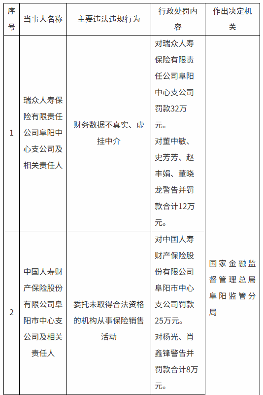 具体来看,瑞众人寿保险阜阳中心支公司因财务数据不真实、虚挂中介领罚,公司被罚款32万元,董中敏、史芳芳等4名责任人获警告并合计罚款12万元;