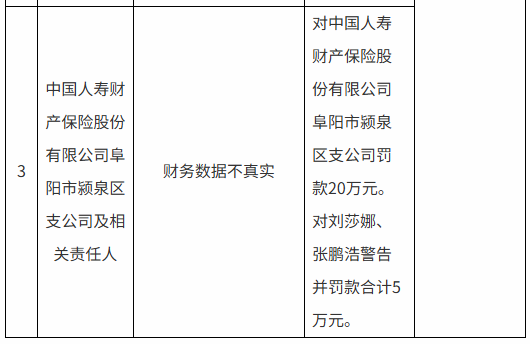 中国人寿财险阜阳市颍泉区支公司因财务数据不真实被罚20万元,刘莎娜、张鹏浩2名责任人被警告并合计罚款5万元。