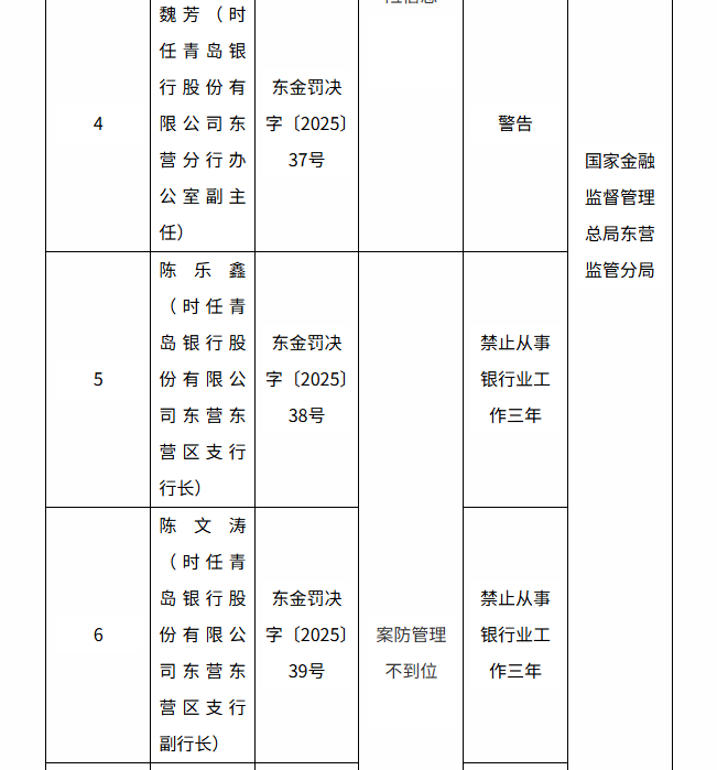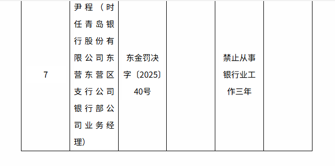 财韵洞察网||2026年1月7日,国家金融监督管理总局东营监管分局对青岛银行股份有限公司东营分行开出罚单(东金罚决字〔2025〕34 号 - 40 号)。