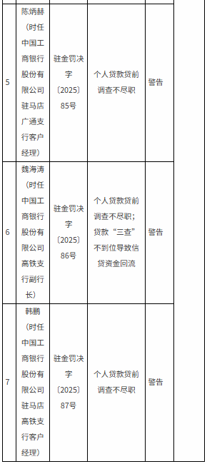 工商银行驻马店分行则因个人贷款贷前调查不尽职、贷款“三查”不到位导致信贷资金回流,被罚款60万元;时任广通支行客户经理陈炳赫、高铁支行副行长魏海涛、高铁支行客户经理韩鹏,分别因贷前调查不尽职或信贷资金管理疏漏被警告。