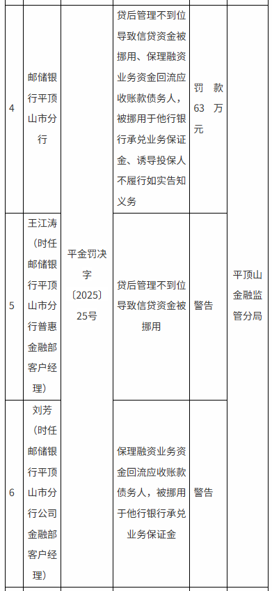 邮储银行平顶山市分行因贷后管理不到位致信贷资金被挪用、保理融资资金回流且挪作他用、诱导投保人不履行如实告知义务,被罚63万元,时任普惠金融部客户经理王江涛、公司金融部客户经理刘芳遭警告;