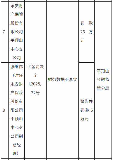 永安财险平顶山中心支公司因财务数据不真实被罚26万元,时任副总经理张继伟被警告并罚款5万元;