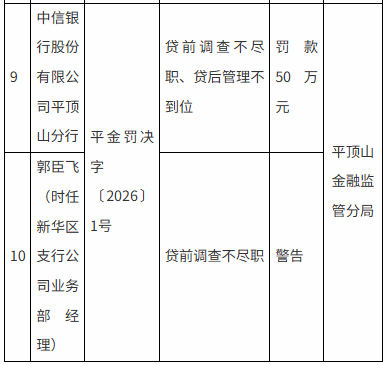 中信银行平顶山分行因贷前调查不尽职、贷后管理不到位被罚50万元,时任新华区支行公司业务部经理郭臣飞被警告。