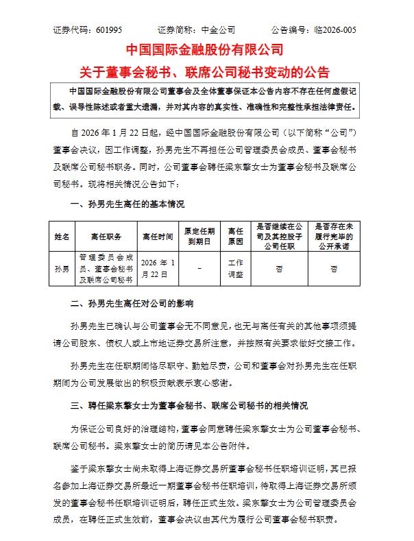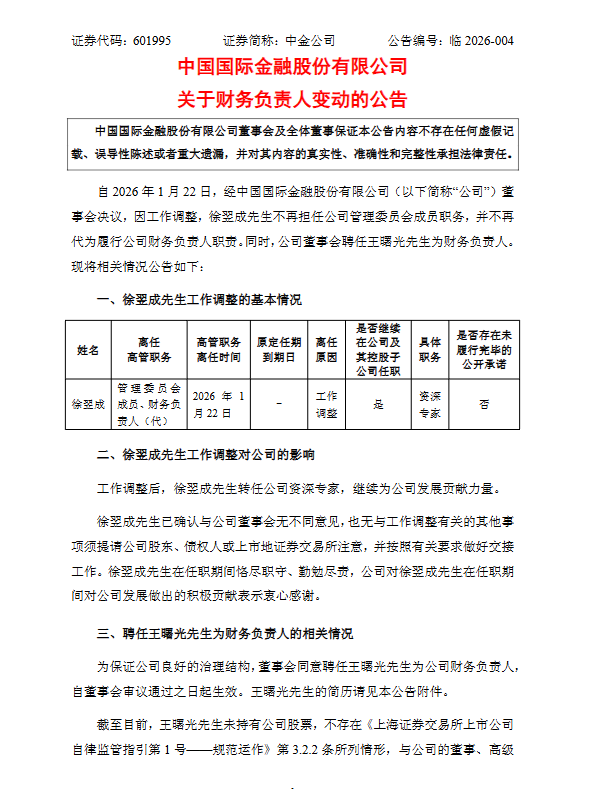 财韵洞察网||2026年1月22日,中国国际金融股份有限公司(证券代码:601995,简称 “中金公司”)连发两则人事变动公告,完成财务负责人、董事会秘书及联席公司秘书岗位的调整,以优化公司治理结构。