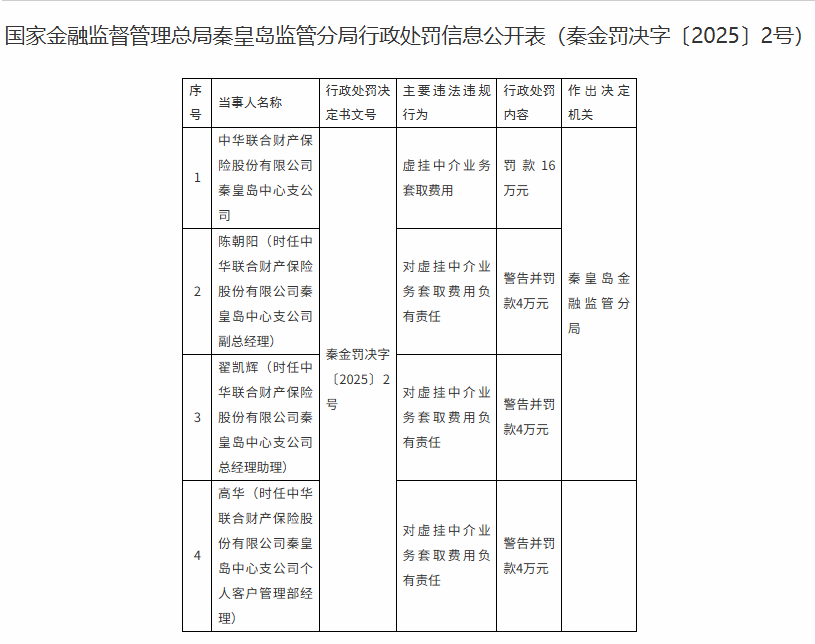 中华联合财产保险股份有限公司秦皇岛中心支公司存在虚挂中介业务套取费用的违法违规行为,被罚16万元;时任该公司副总经理陈朝阳、总经理助理翟凯辉、个人客户管理部经理高华均因负有责任,分别被处以警告并罚款4万元(处罚文号:秦金罚决字〔2025〕2 号)。