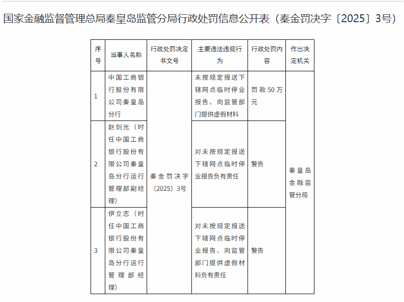 中国工商银行股份有限公司秦皇岛分行因未按规定报送下辖网点临时停业报告、向监管部门提供虚假材料,被罚款50万元;时任该行运行管理部副经理赵剑光、经理伊立志因分别对相关违法违规行为负有责任,均受到警告处罚(处罚文号:秦金罚决字〔2025〕3 号)。