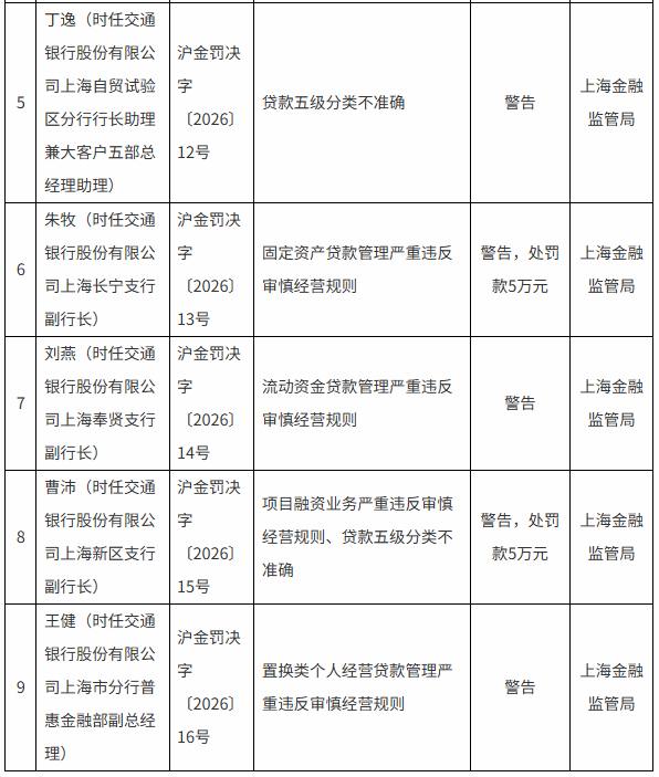 根据行政处罚信息公开表(沪金罚决字〔2026〕8-16号),交行上海分行涉及七项违法违规行为,主要体现在信贷业务全流程管控失守:除违规向关系人发放信用贷款、对部分贷款品种违规免息外,更暴露出多类贷款管理违反审慎经营规则,涵盖项目融资、流动资金、固定资产及置换类个人经营贷款等领域,同时存在贷款五级分类不准确问题。