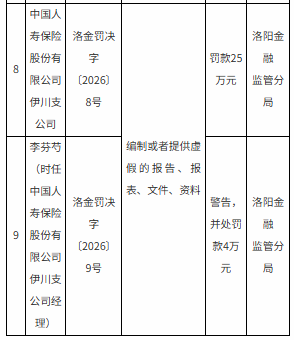 中国人寿保险股份有限公司伊川支公司因“编制或者提供虚假的报告、报表、文件、资料”,被罚款25万元;相关负责人李芬芍被处罚款4万元。