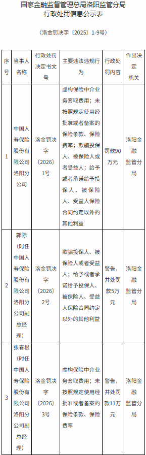 财韵洞察网||1月30日,国家金融监督管理总局洛阳监管分局发布行政处罚信息公示(洛金罚决字〔2025〕1-9 号),对中国人寿保险股份有限公司洛阳分公司及其下属机构开出9张罚单,合计罚款151万元,涉及多项违法违规及多名高管。