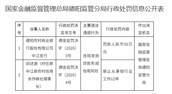 德阳农村商业银行股份有限公司中江支行被处以罚款50万元,时任原中江县农村信用合作联社理事长邱述源被禁止从事银行业工作12年。