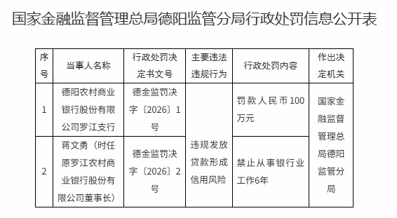 其中,德阳农村商业银行股份有限公司罗江支行被处以罚款100万元,时任原罗江农村商业银行股份有限公司董事长蒋文勇被禁止从事银行业工作6年。